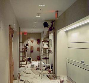 CUSTOM CORRIDOR PAINTING We repainted the corridor areas of this twelve story office building. The wall and ceiling surfaces were painted in a satin enamel finish and the accent panels and graphics were completed in a Zolotone product. |